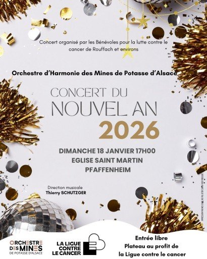 L'Orchestre d'Harmonie des Mines de Potasses d'Alsace vous invite au Concert du nouvel an 2026 au profit de la ligue contre le cancer le 18 janvier à 17h00 Eglise St Martin à Pfaffenheim